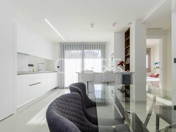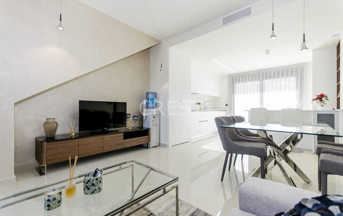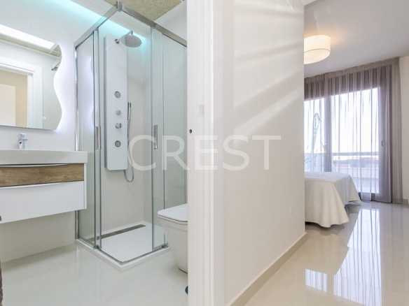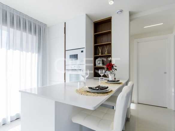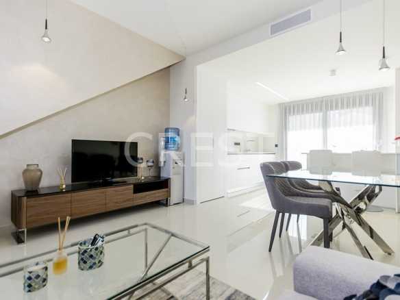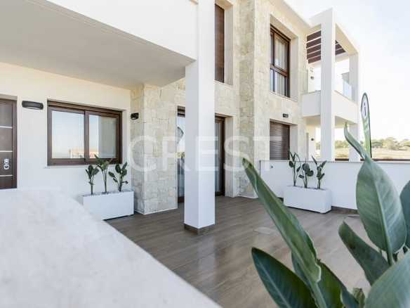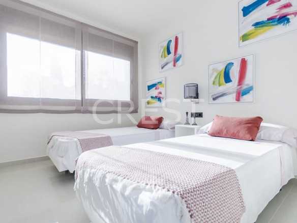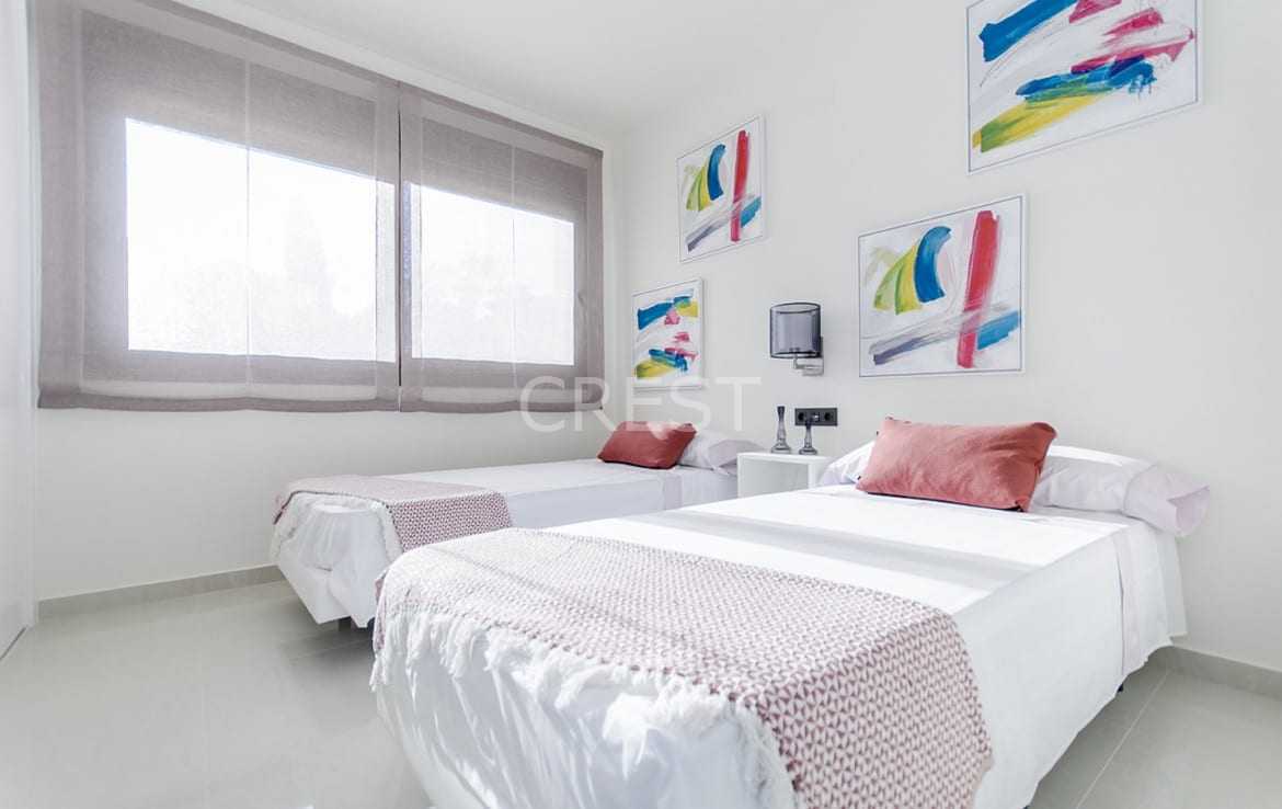 This modern new-build complex is located in a pleasant, quiet neighbourhood, opposite the salt lakes of Torrevieja. An ideal place for a luxury holiday in a natural environment or for those who do not want to live too far from the beautiful beaches of Orihuela Costa. This residence, is made up of 98 apartments, has a beautifully landscaped communal garden with two large swimming pools and green areas. All amenities are close by with a large selection of restaurants, shopping centres and an abundance of leisure facilities. Located on the ground floor, this apartment has 2 bedrooms and 2 bathrooms and 2 private large terraces, one with a view of the swimming pool and garden. The residence is delivered with pre-installation for air conditioning and there is the option of an underground parking space with storage room.