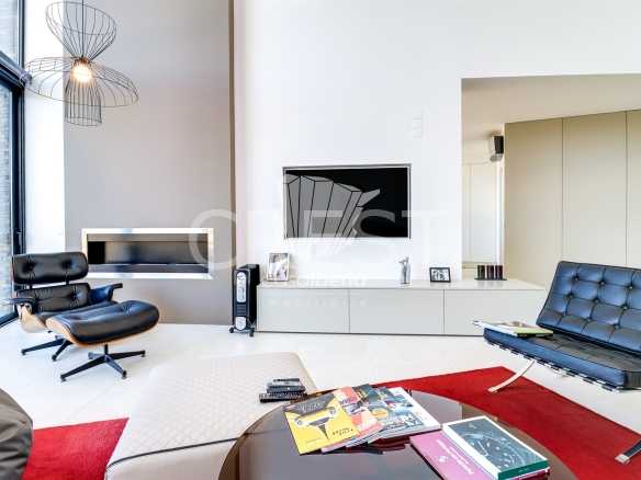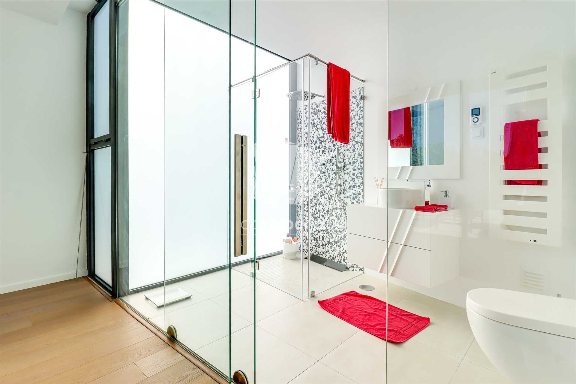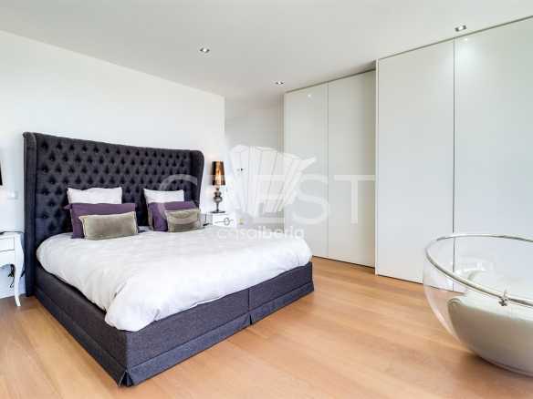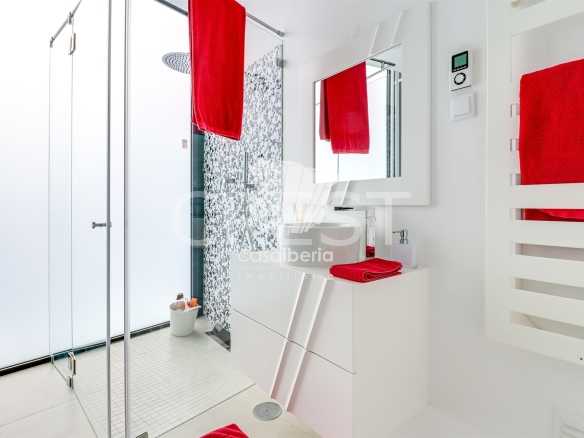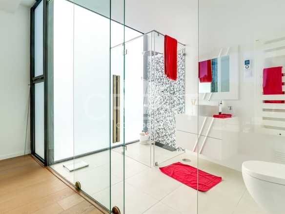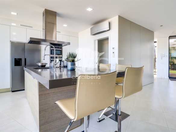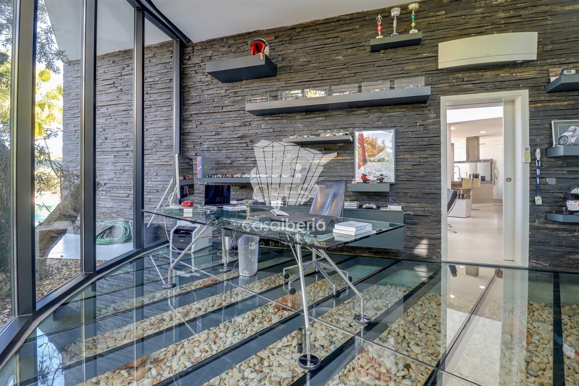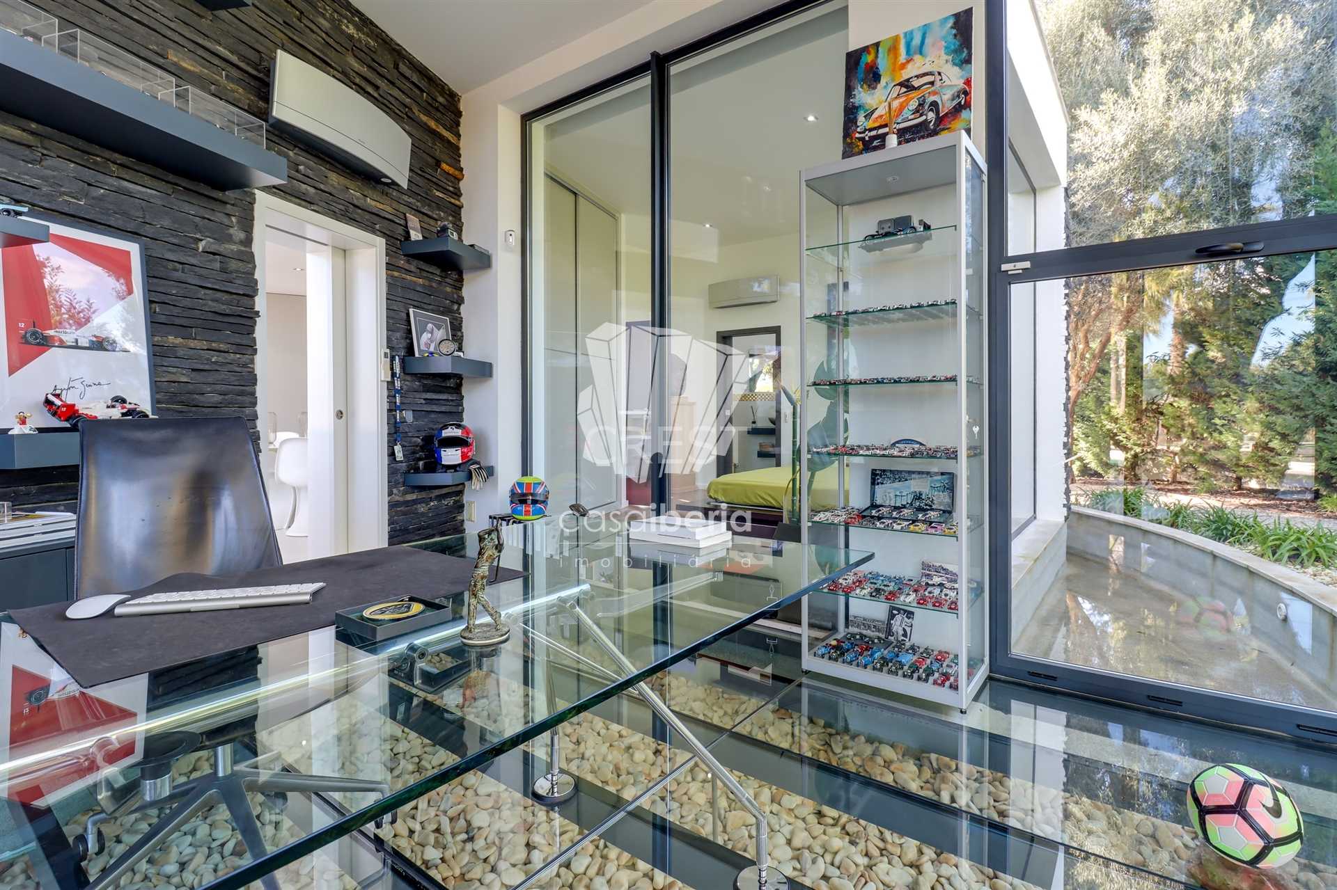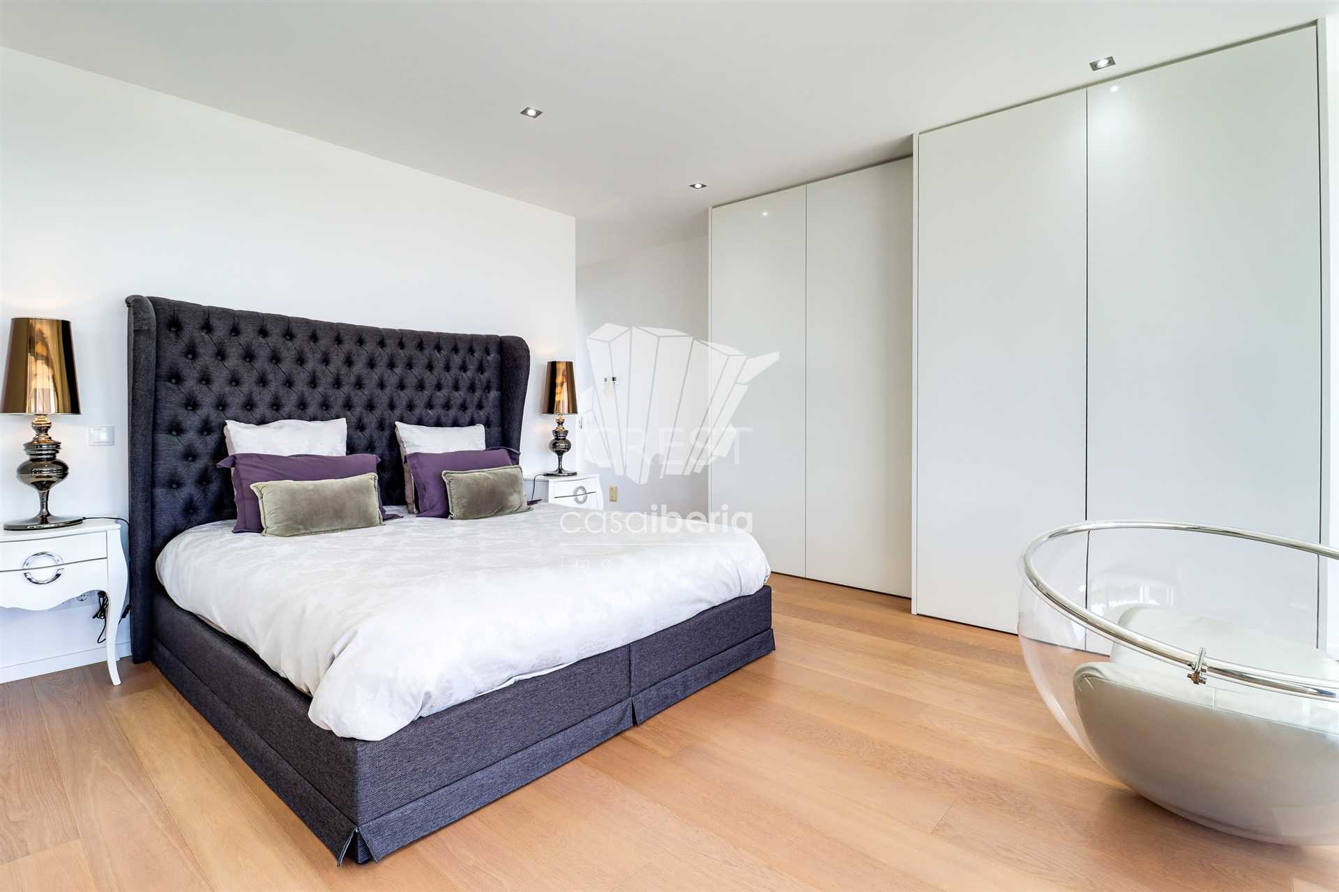 On the ground floor, you’ll find a spacious and bright living room with a fireplace and high ceilings, creating an unparalleled sense of space and sophistication. The fully equipped kitchen includes a practical pantry and combines functionality with modern design. This level also features an office — perfect for remote work or as a multifunctional space — two large suites with built-in wardrobes and private bathrooms, and an additional guest bathroom. The villa is equipped with underfloor heating and air conditioning, ensuring year-round thermal comfort.