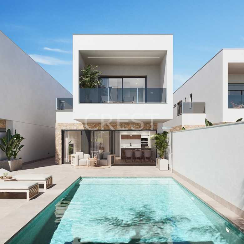 This delightful villa offers a spacious master bedroom that opens onto a large terrace, a beautifully landscaped private garden, and ample space for alfresco dining. The interior is adorned with high-quality Porcelanosa tiles throughout and comes fully equipped with air conditioning, double glazing, a modern fitted kitchen, and security features for peace of mind. With three spacious bedrooms, including a master suite with en-suite bathroom, two luxurious bathrooms, and an open plan living and dining area, this villa perfectly combines comfort and style.