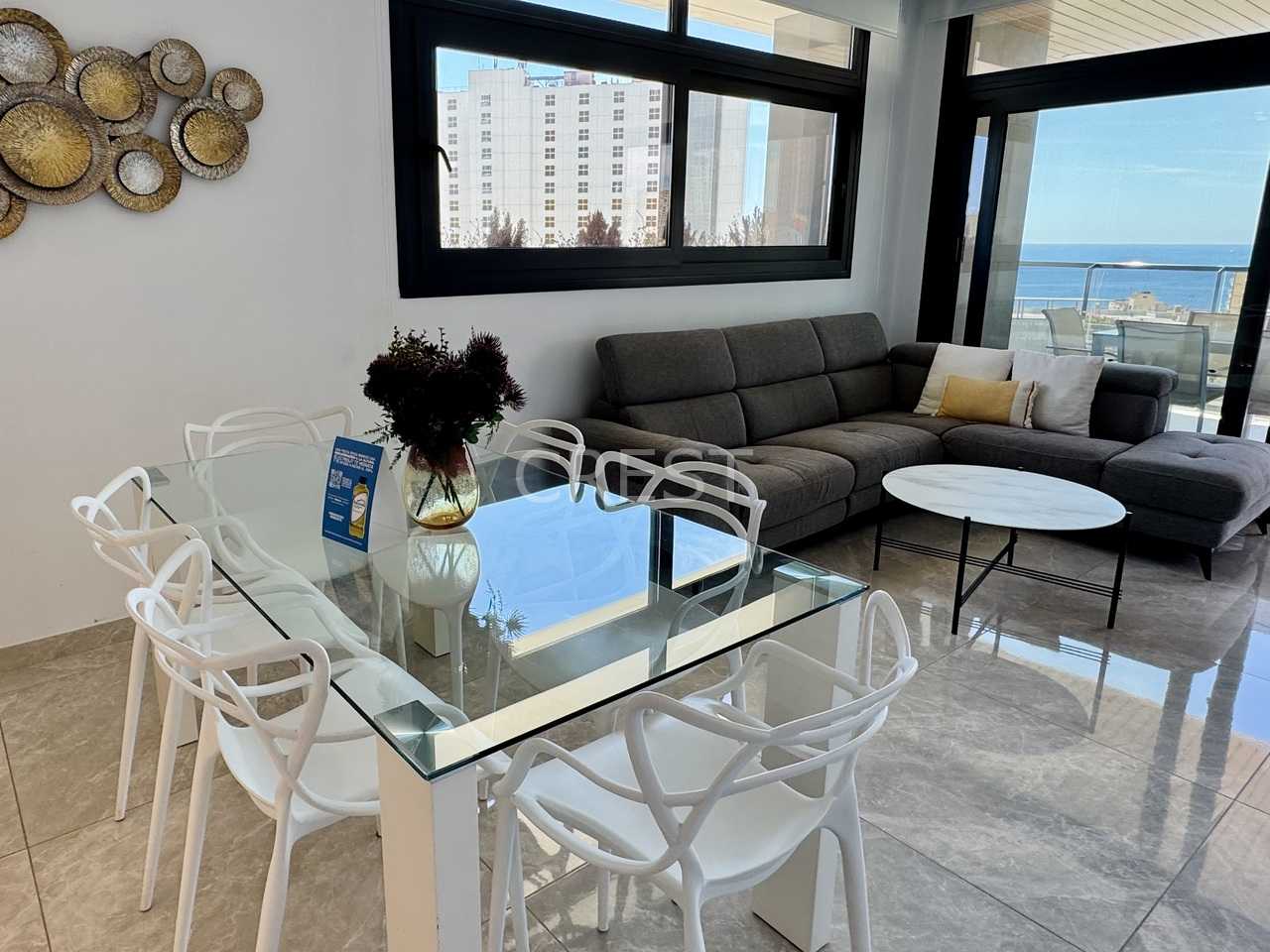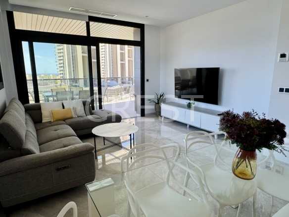 The apartment features three spacious bedrooms and two fully equipped bathrooms, offering the ideal layout for family living or hosting guests. The bright and airy living room opens up to an impressive terrace, perfect for relaxing, sunbathing, or enjoying meals outdoors with panoramic views of the Mediterranean Sea.