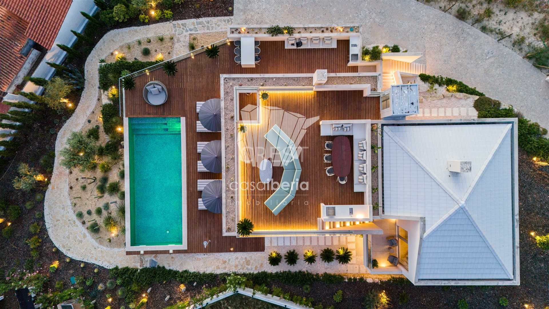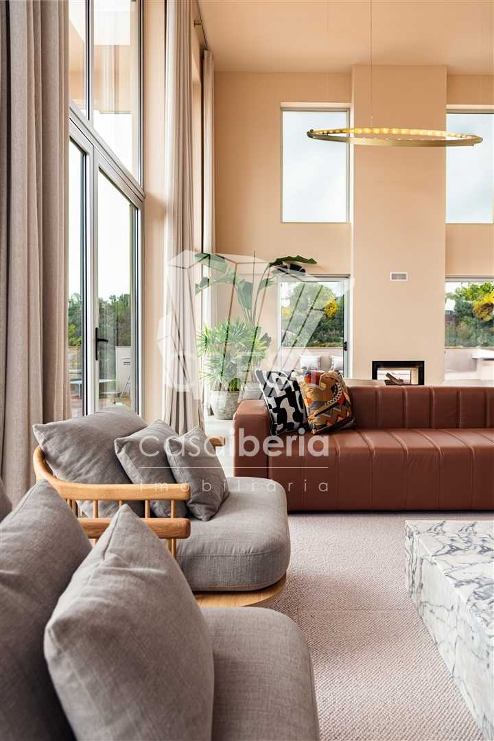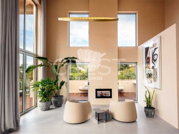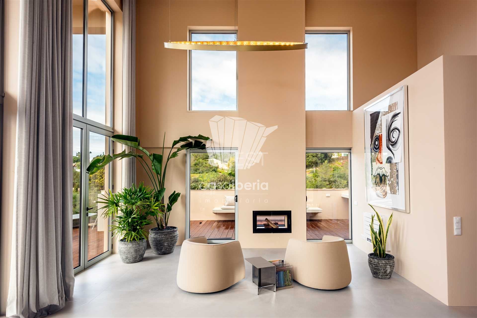 You have access to the main level via the staircase or the lift, where you are greeted with a spacious living area with six meter high celings and fireplace with french doors that guide you out to the terrace and the ten pool.