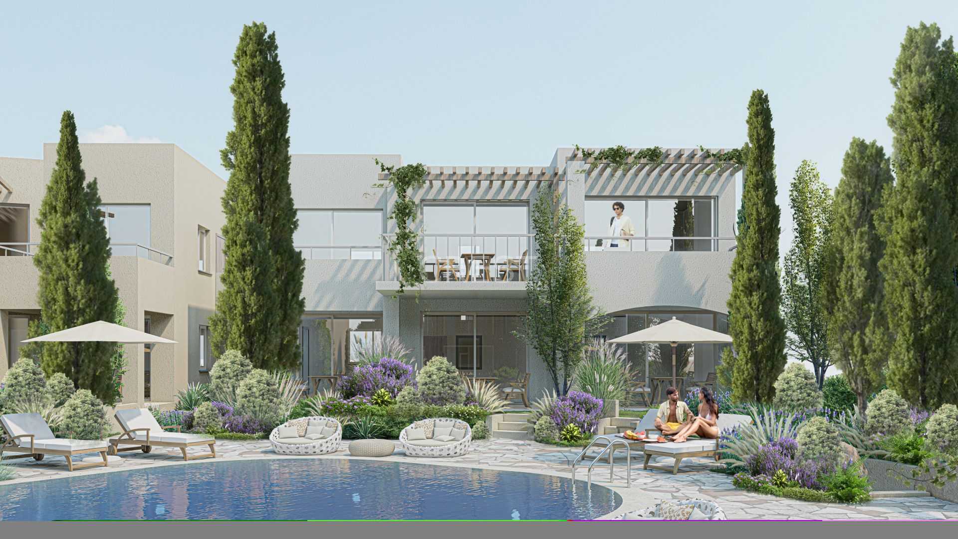 The apartment is centered around a large communal pool, perfect for relaxing and enjoying the sunny days. It comes fully furnished with built-in appliances, providing a comfortable and convenient living experience.