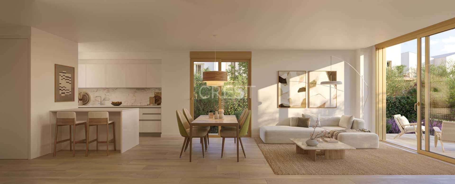 With a strong focus on environmental preservation, the development integrates innovative sustainability strategies. These include systems for collecting, channeling, and reusing rainwater to support a thriving eco-friendly landscape; gardens planted with native species that require minimal upkeep; expansive photovoltaic panel installations for generating energy for self-consumption; and multiple charging points for electric vehicles.