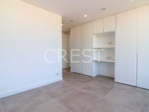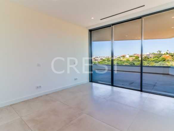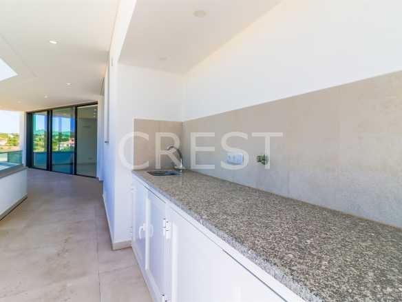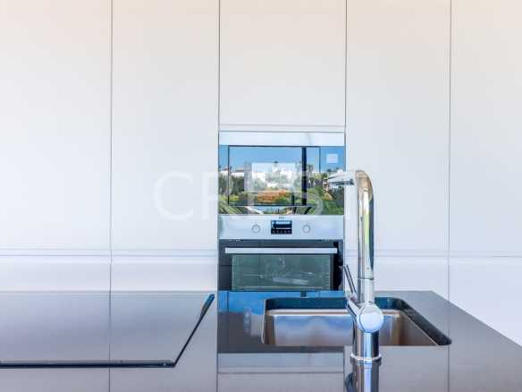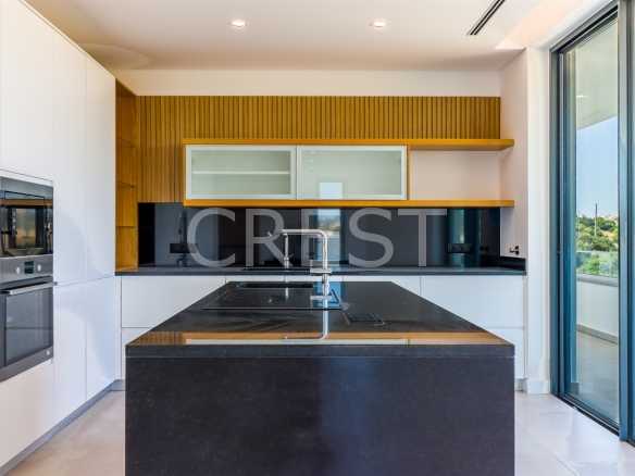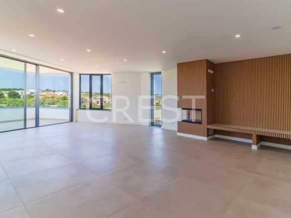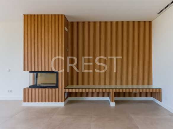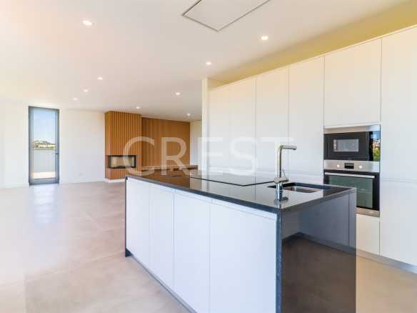 Spacious open-plan living room with a modern fireplace and a fully equipped kitchen with top-of-the-line appliances. Both rooms open onto a generous terrace with stunning views of the ocean.