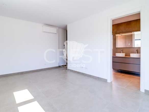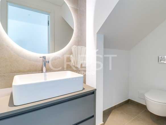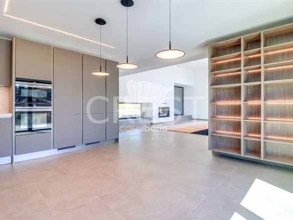 Upon entering through the main entrance, we are greeted by a hallway leading to a spacious living-dining room and an open-plan kitchen, equipped with high-quality appliances. In the living room, we have access to a covered terrace, which offers and allows us to enjoy the view of the garden and the pool.