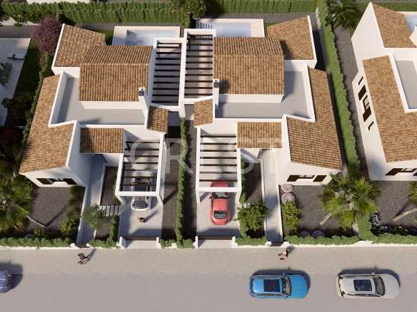 The villas include a spacious living room with open kitchen and storage room, 3 bedrooms and 2 bathrooms, the master bedroom with dressing room. Cosy garden with terrace and private pool and a parking space.