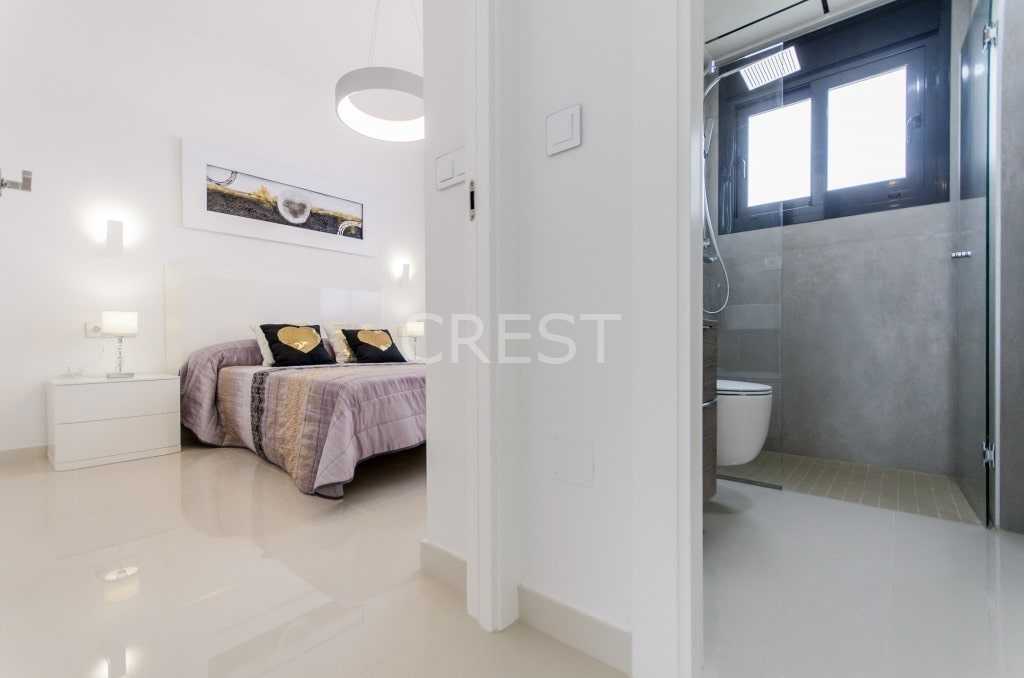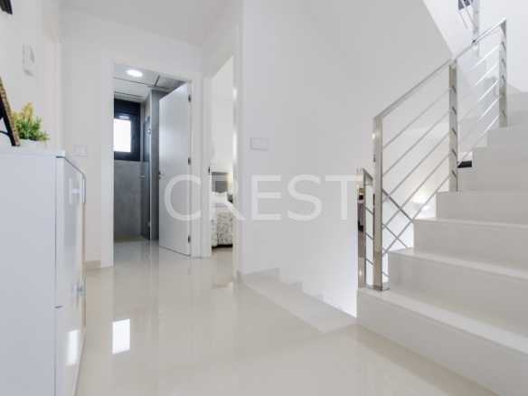 This villa is located in San Miguel de Salinas with beautiful views of the Mediterranean Sea and only 7 kilometers from the famous beaches of Orihuela Costa. Surrounded by golf courses, in the middle of nature and close to the famous shopping center “La Zenia Boulevard”. This villa has on the ground floor a spacious bedroom with private bathroom, a guest toilet, a cozy open living room with kitchen with direct access to the garden and a private pool. On the first floor there are three more large bedrooms, one with a private bathroom and terrace and a separate bathroom for the other two bedrooms. From the 45.80 m2 roof terrace you can enjoy a magnificent view of the surrounded countryside and the Mediterranean Sea. The private parking on the plot is covered with a pergola.